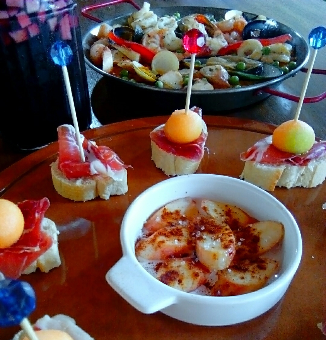 Autenticas tapas españolas, pulpo a la gallega en rodajas, con pimentón picante $9.500 y tapita de jamón serrano con bolita de melón, la entrada más refrescante $4.500